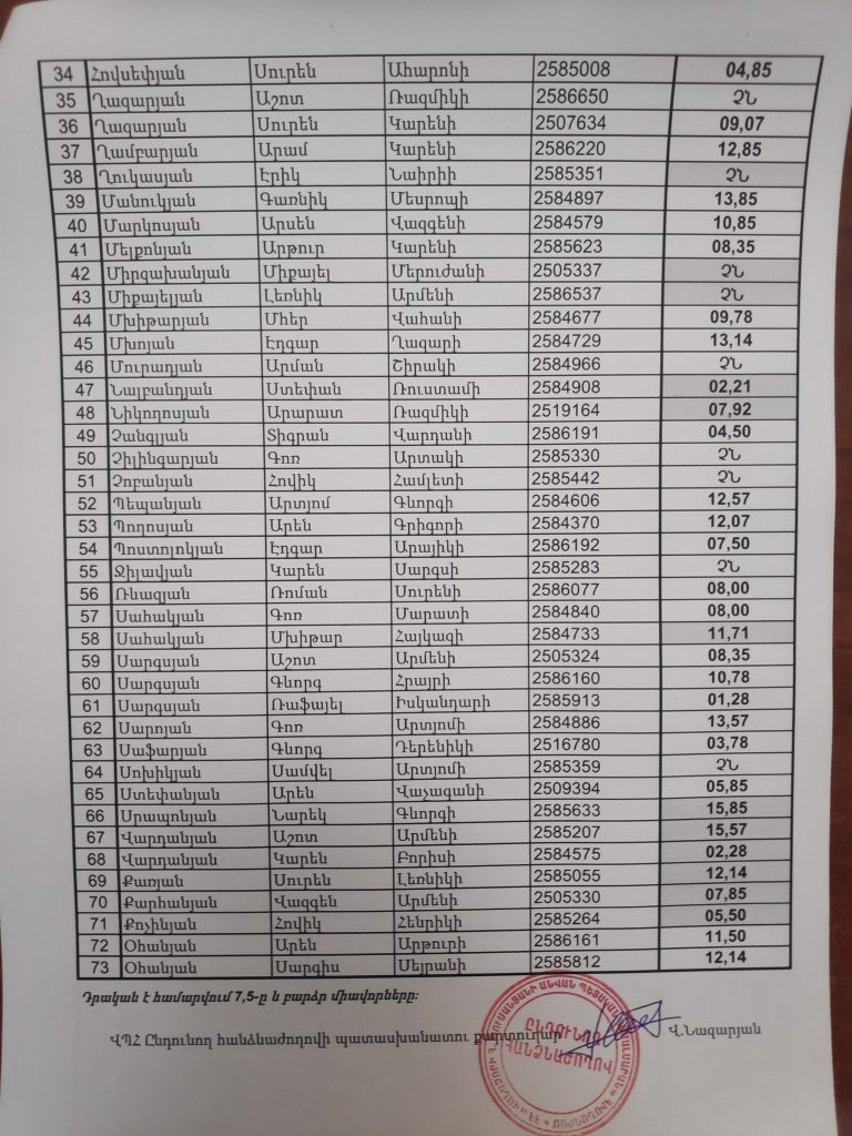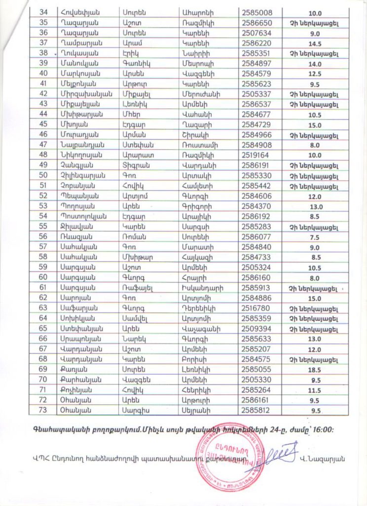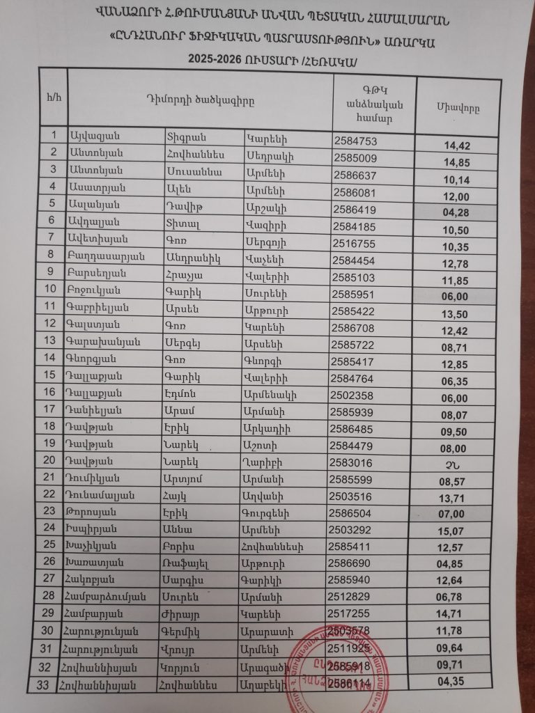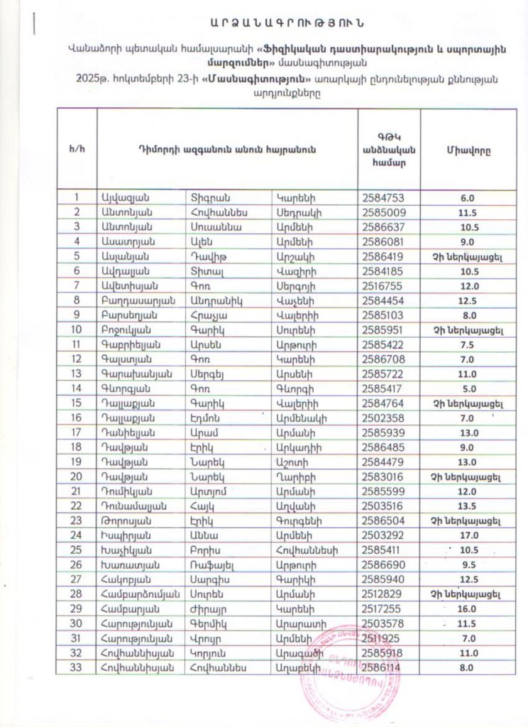 2025-2026 ուստարվա ընդունելության քննության արդյունքները. Ընդհանուր ֆիզիկական պատրաստություն 2025-2026 ուստարվա ընդունելության քննության արդյունքները. Մասնագիտություն