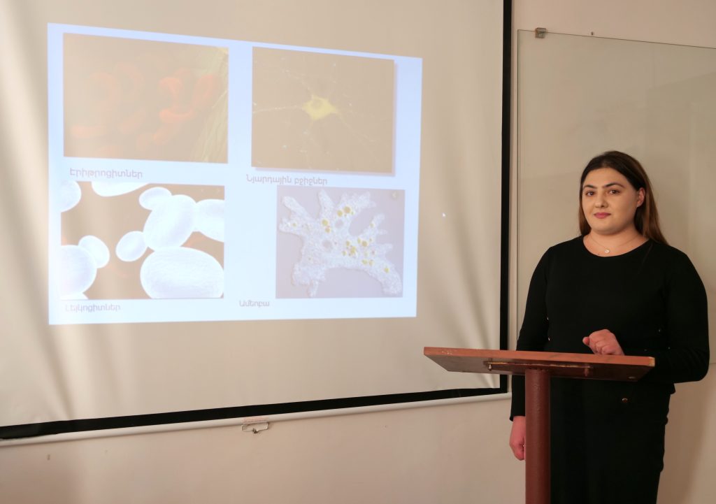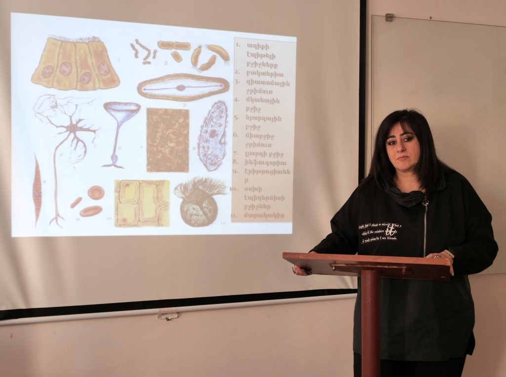 Քիմիայի և կենսաբանության ամբիոնի դոցենտ, կենսաբանական գիտությունների թեկնածու, Գայանե Սահակյանը և ամբիոնի դասախոս Թամարա Մարուքյանը կատարեցին դիտարժան փորձեր, որի արդյունքում աշակերտներն ուսումնասիրեցին բուսական և կենդանական բջիջների կառուցվածքային տարբերությունները, զննեցին բակտերիաներ, արյան ձևավոր տարրեր, պատրաստի պրեպարատներ, նախակենդանիներ, մաշկի բջիջներ։